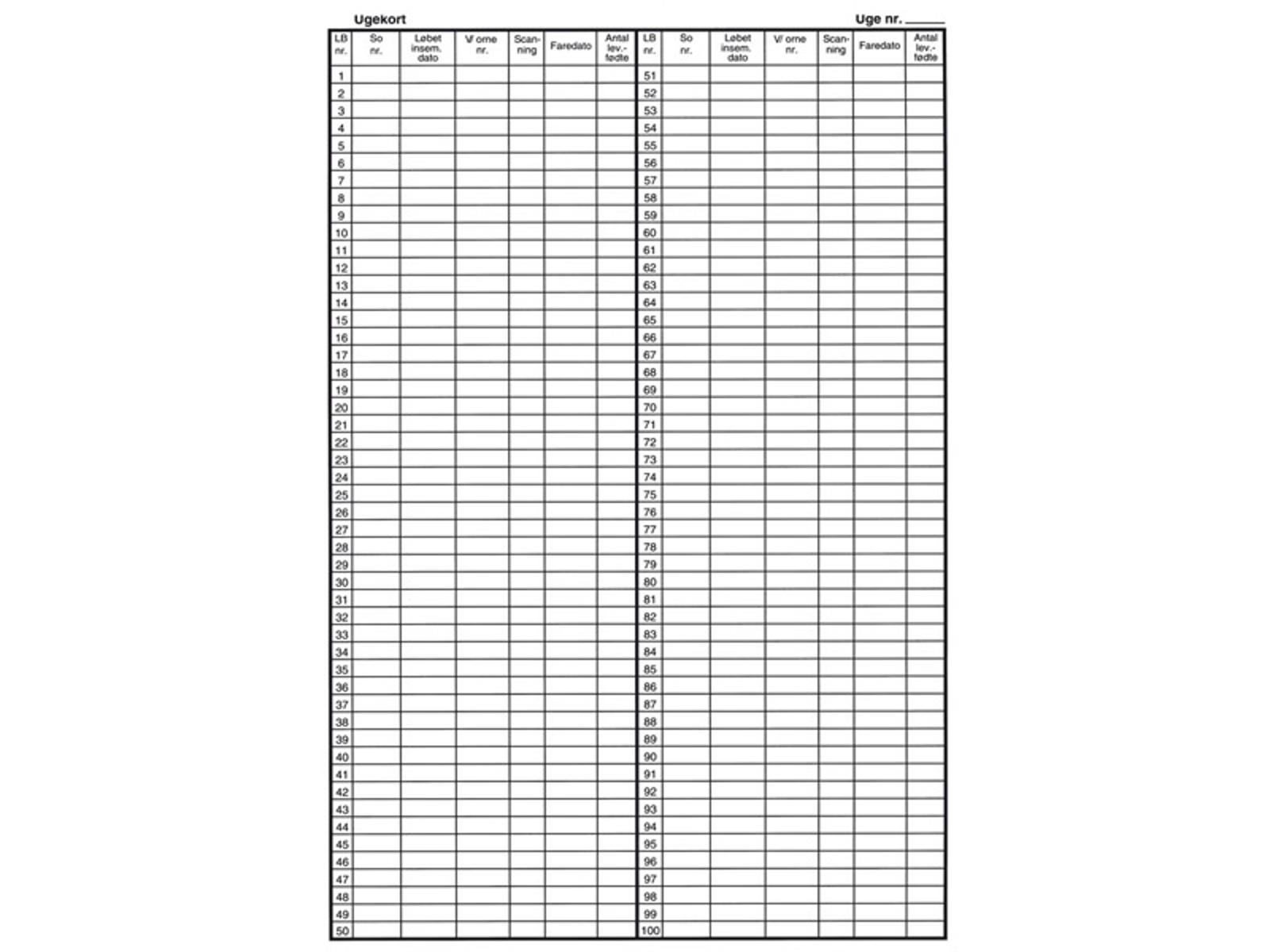 Kortet bruges til at notere løbetider for søer, gylte og polte i samme uge.Dette gør det nemt at kontrollere og behandle dyrene på det rette tidspunkt.Pakke med 25 stk.