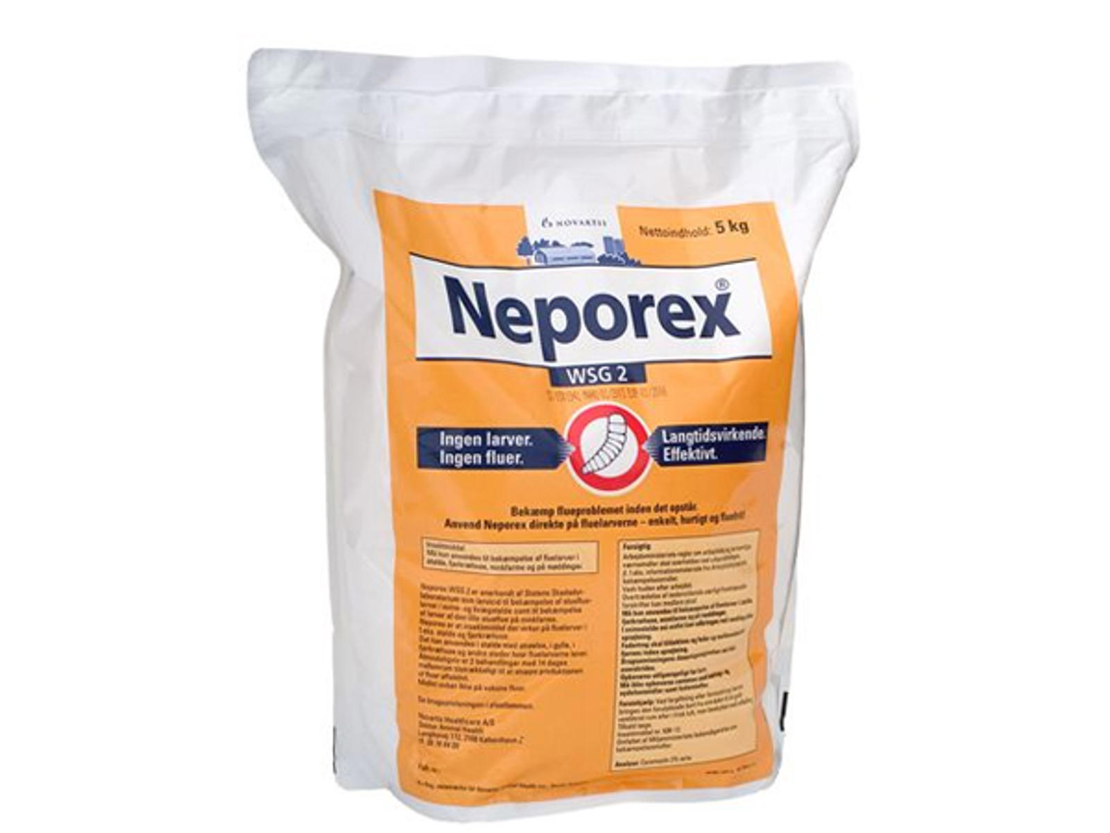 Neporex WSG 2 is a preventive and long-acting drug that combats fly formation already on larval days. The agent can be used everywhere where there are flame arves, in stables with bedding, in liquid natural manure (manure) and at the mood. Generally, 2 treatments at 14 days intervals are sufficient to stop the proliferation of flies efficiently. The agent has no effect on adult flies.